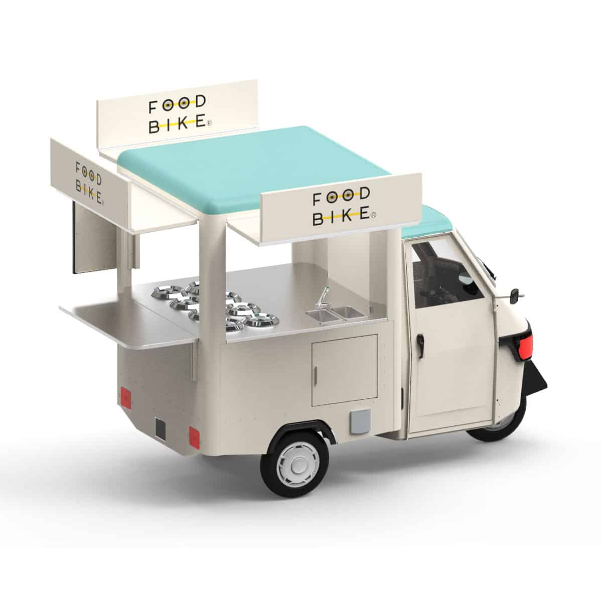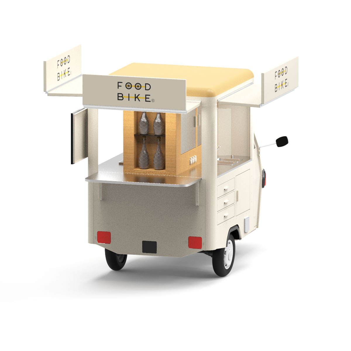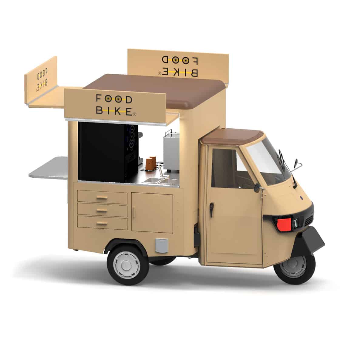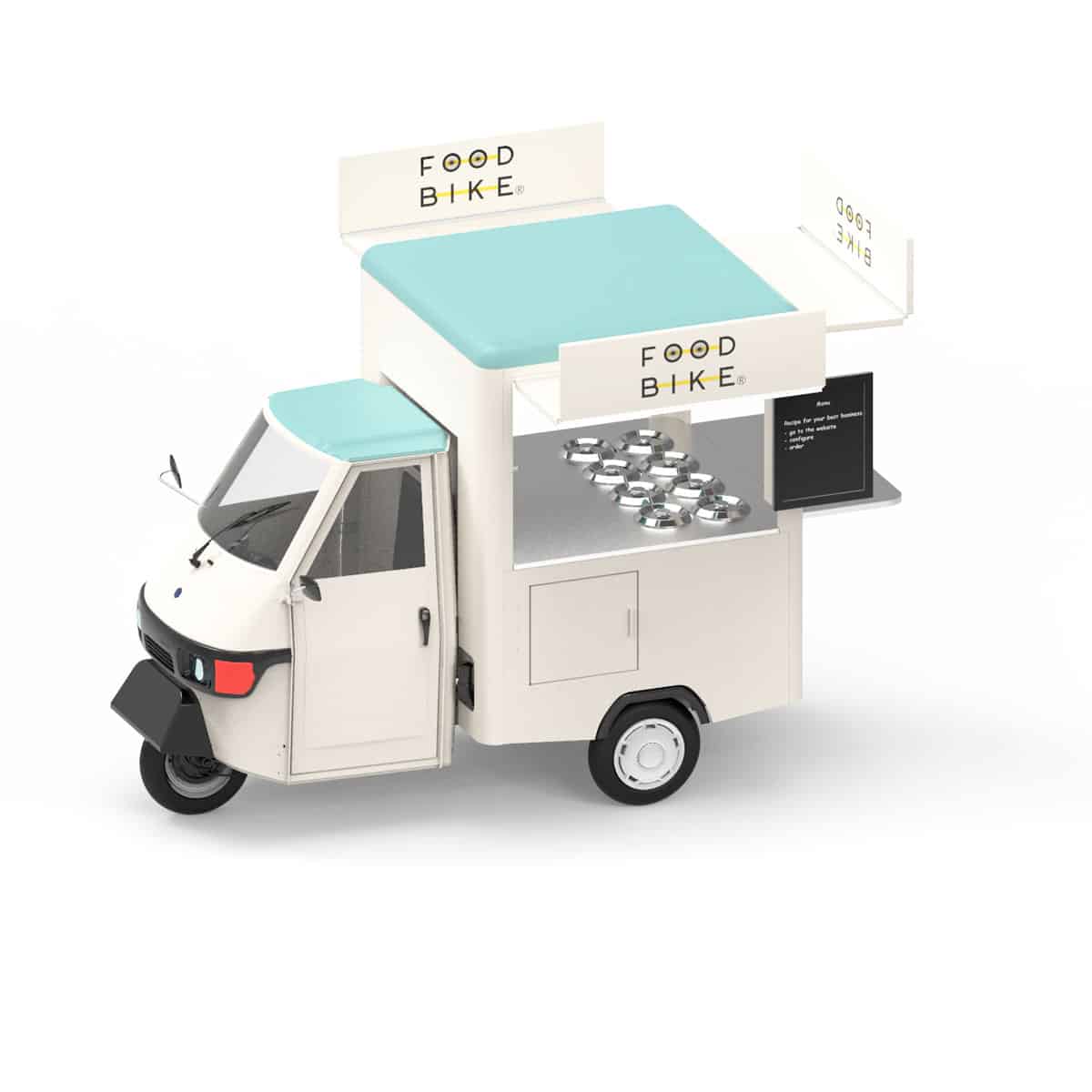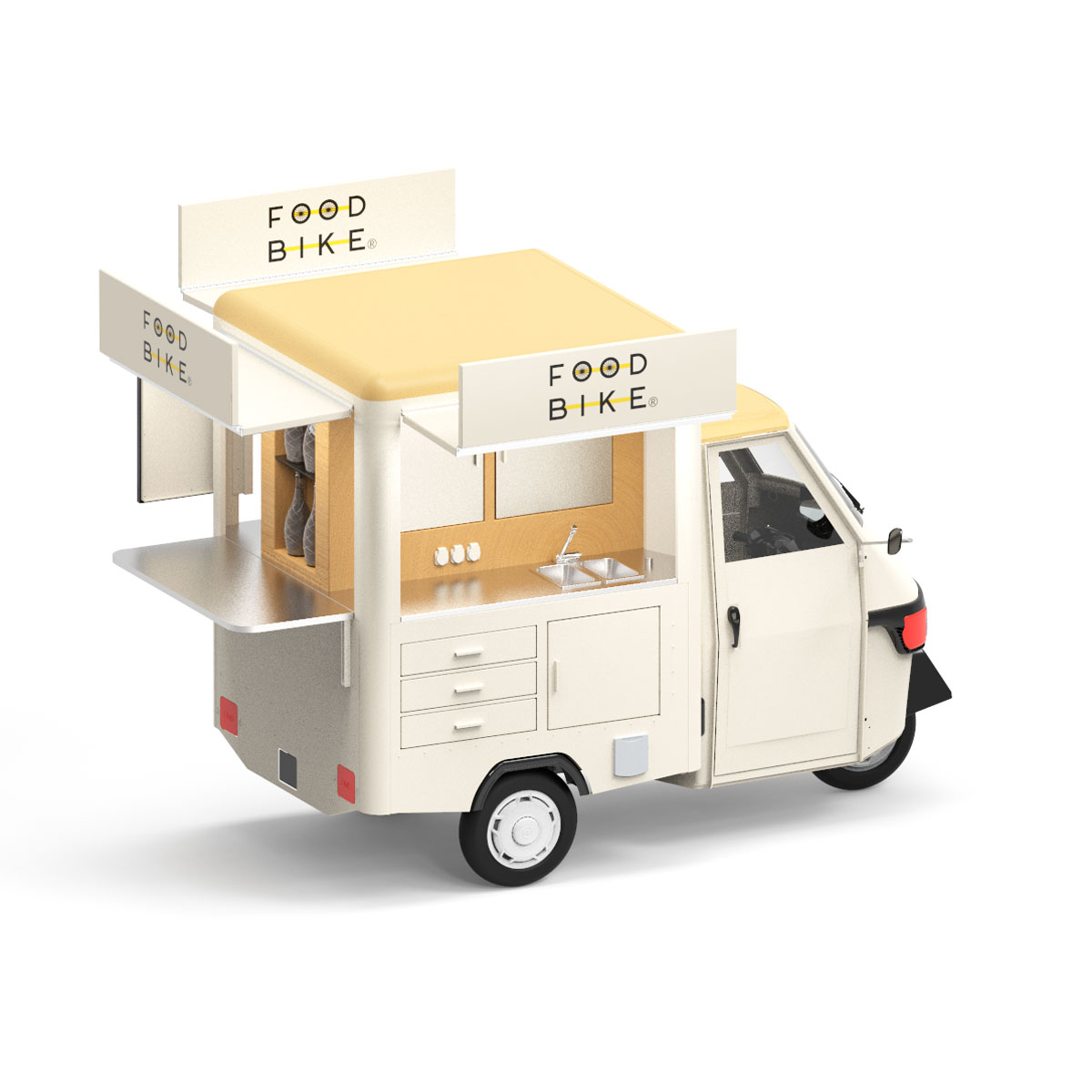 The interior as well as exterior of the module is made of light aluminium. Each version of the truck has is furnished with sanitary annexes with access to hot and cold water. Power system provides over 10 hours of stored energy. Working and folding tables are made of stainless steel. Each Piaggio is equipped with an information board available to customers, which is attached to the front of the truck.