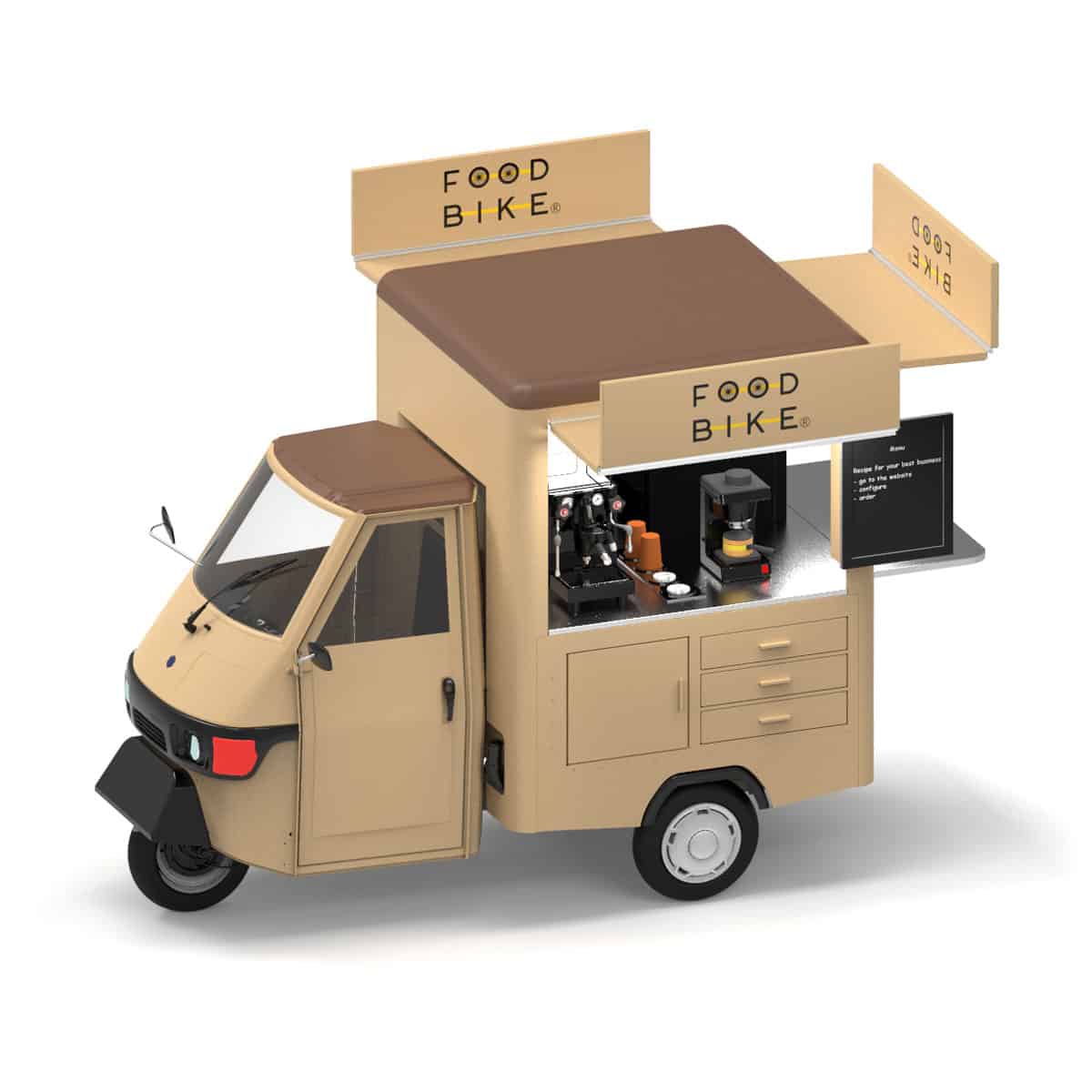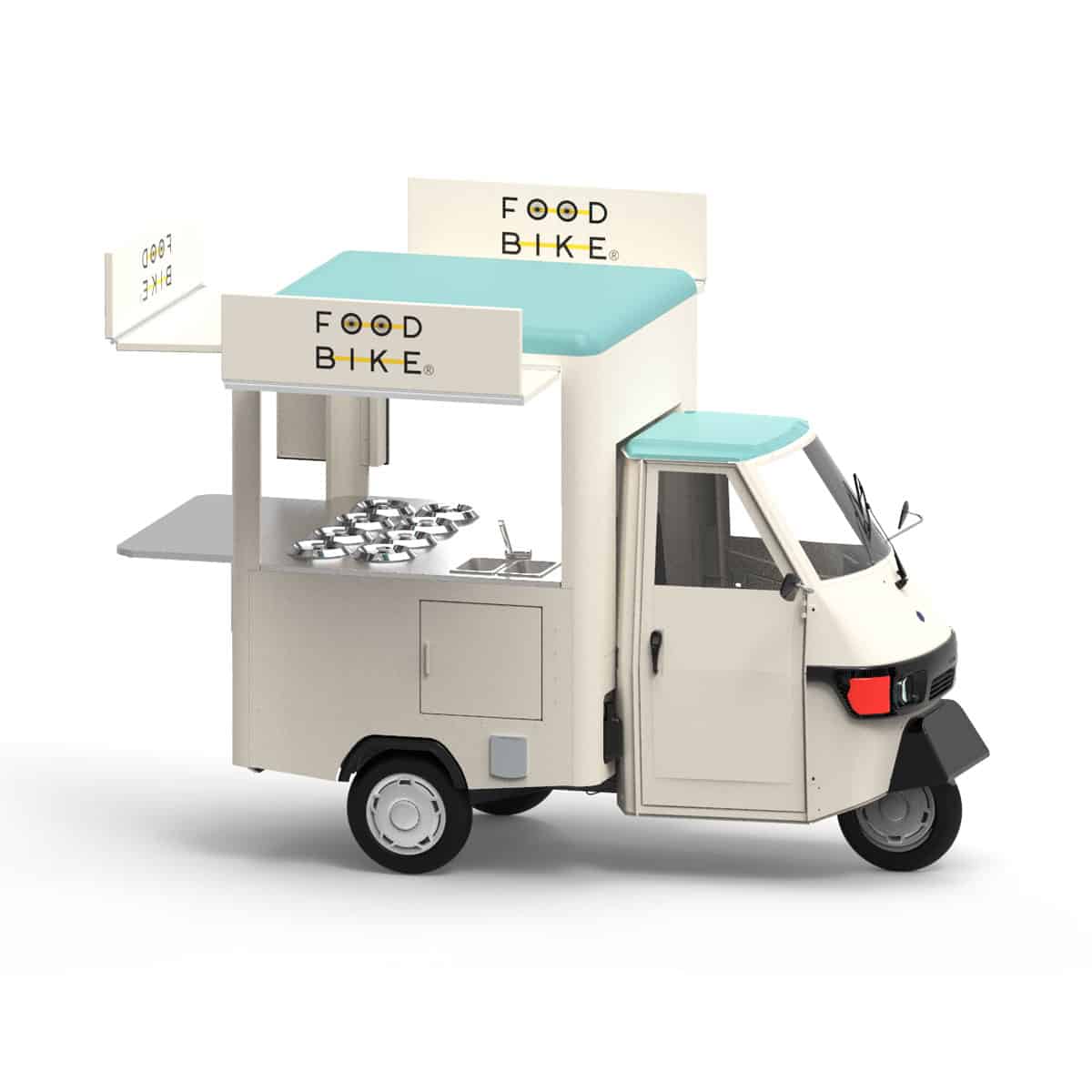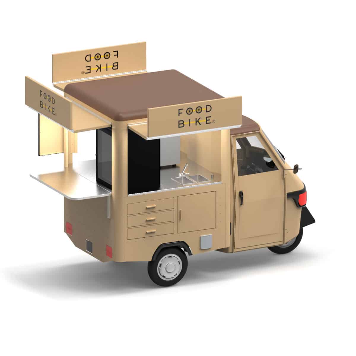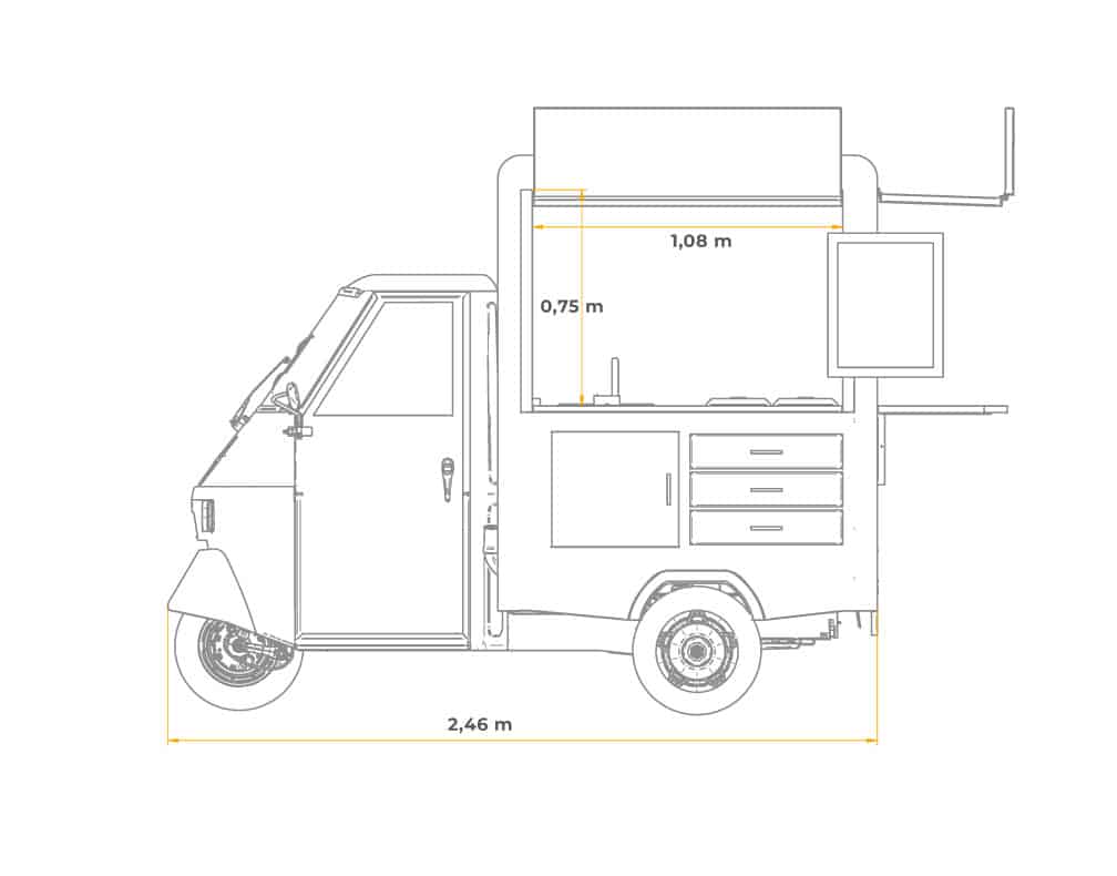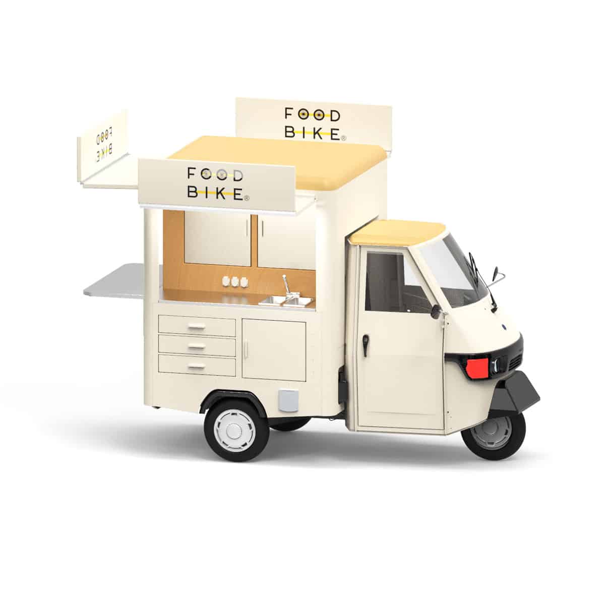 The interior as well as exterior of the module is made of light aluminium. Each version of the truck has is furnished with sanitary annexes with access to hot and cold water. Power system provides over 10 hours of stored energy. Working and folding tables are made of stainless steel. Each Piaggio is equipped with an information board available to customers, which is attached to the front of the truck.