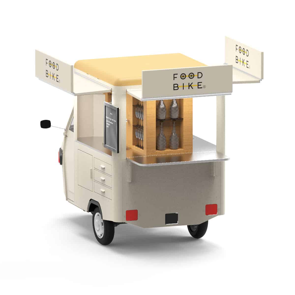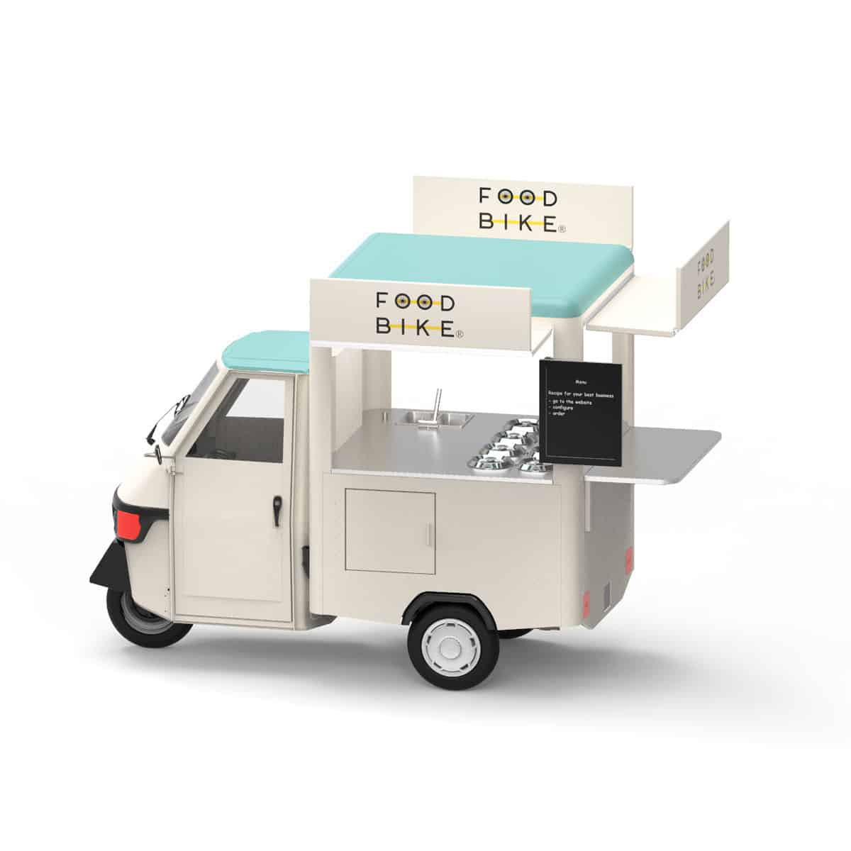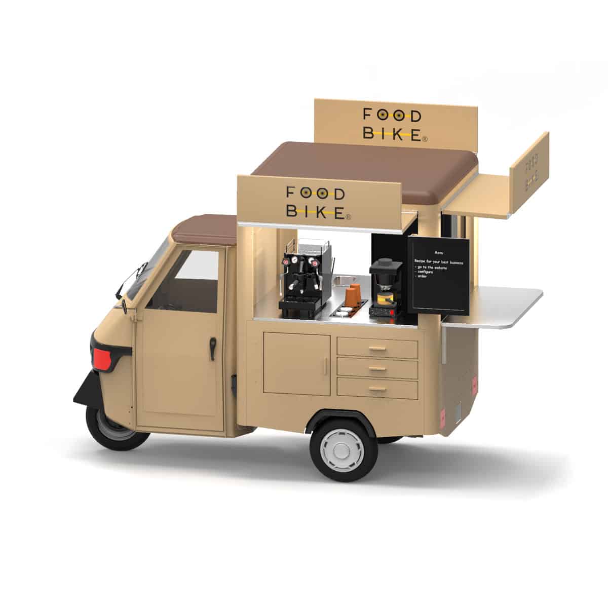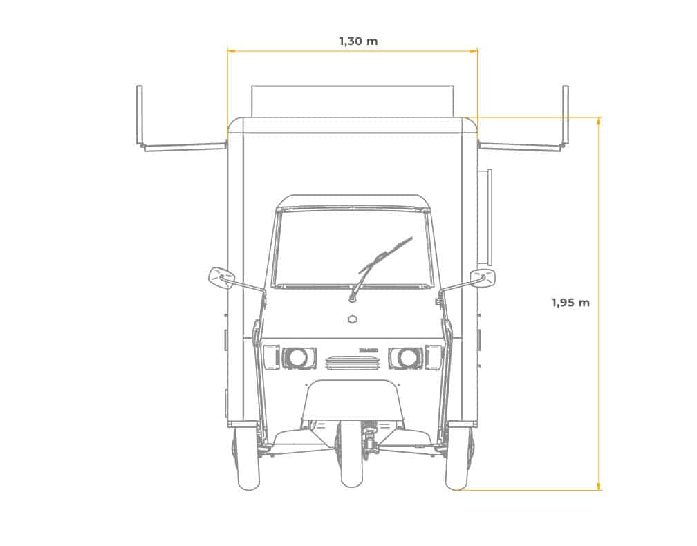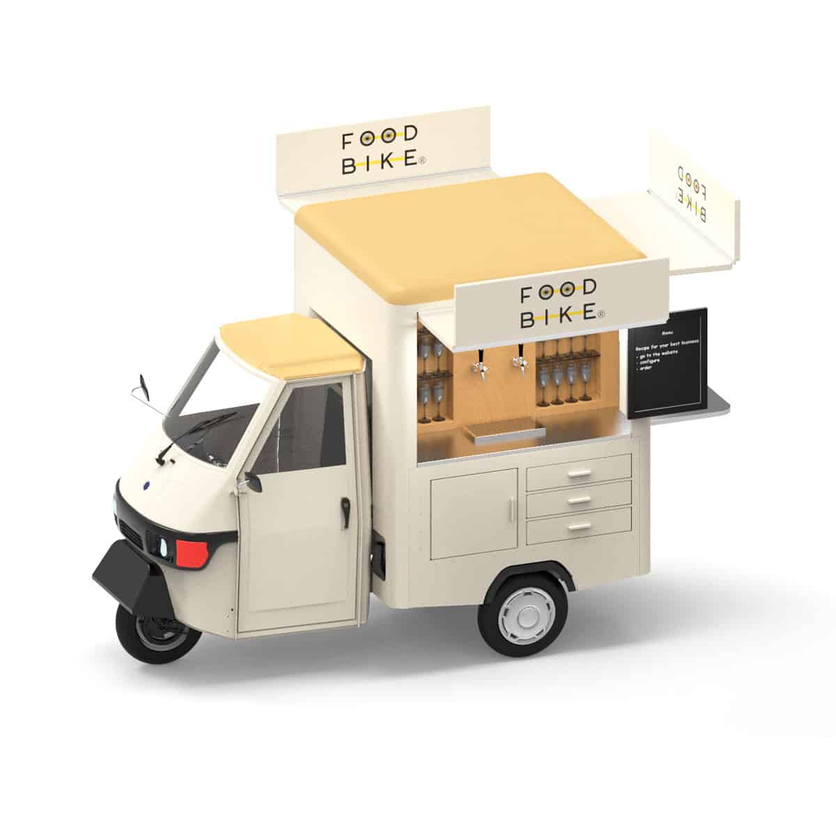 The interior as well as exterior of the module is made of light aluminium. Each version of the truck has is furnished with sanitary annexes with access to hot and cold water. Power system provides over 10 hours of stored energy. Working and folding tables are made of stainless steel. Each Piaggio is equipped with an information board available to customers, which is attached to the front of the truck.