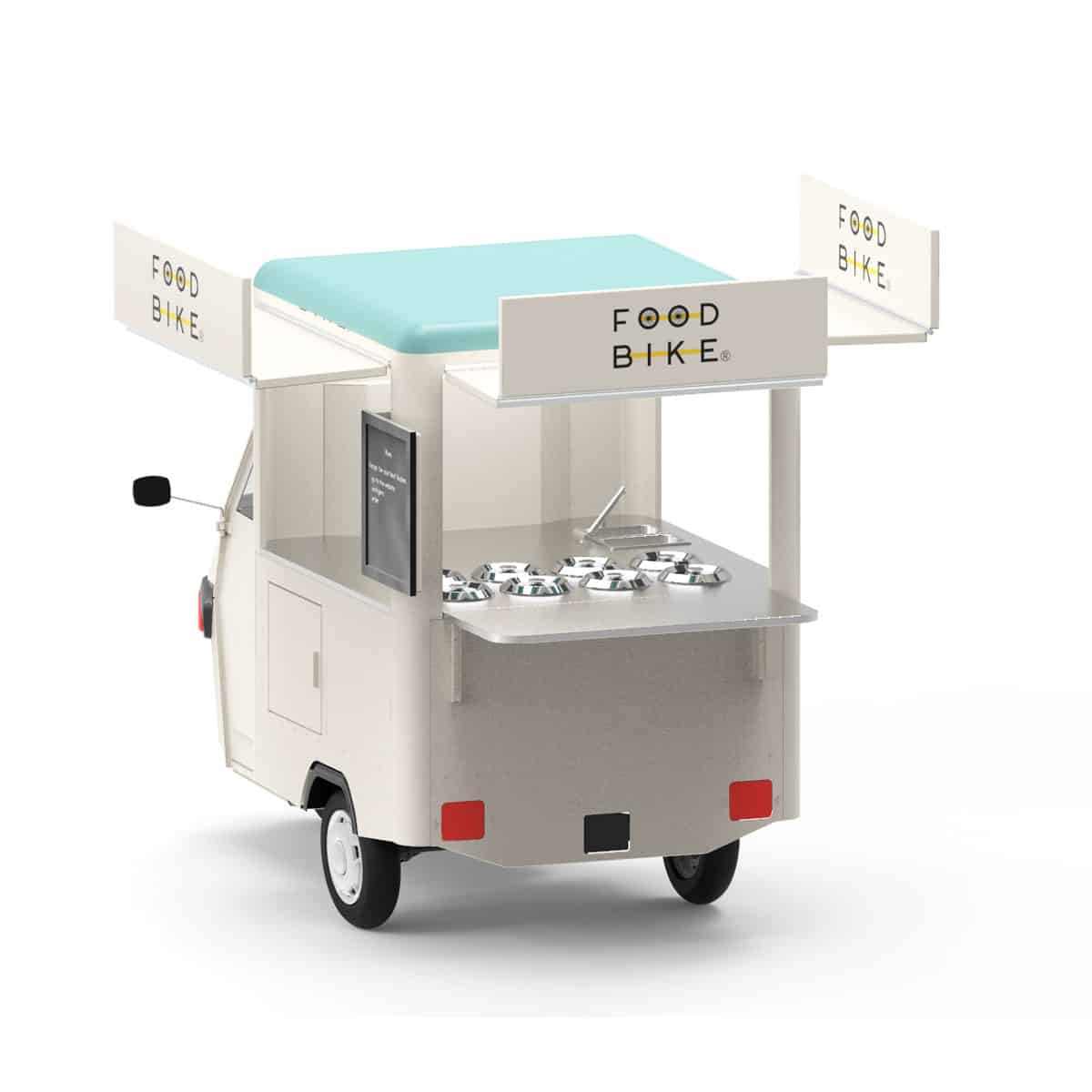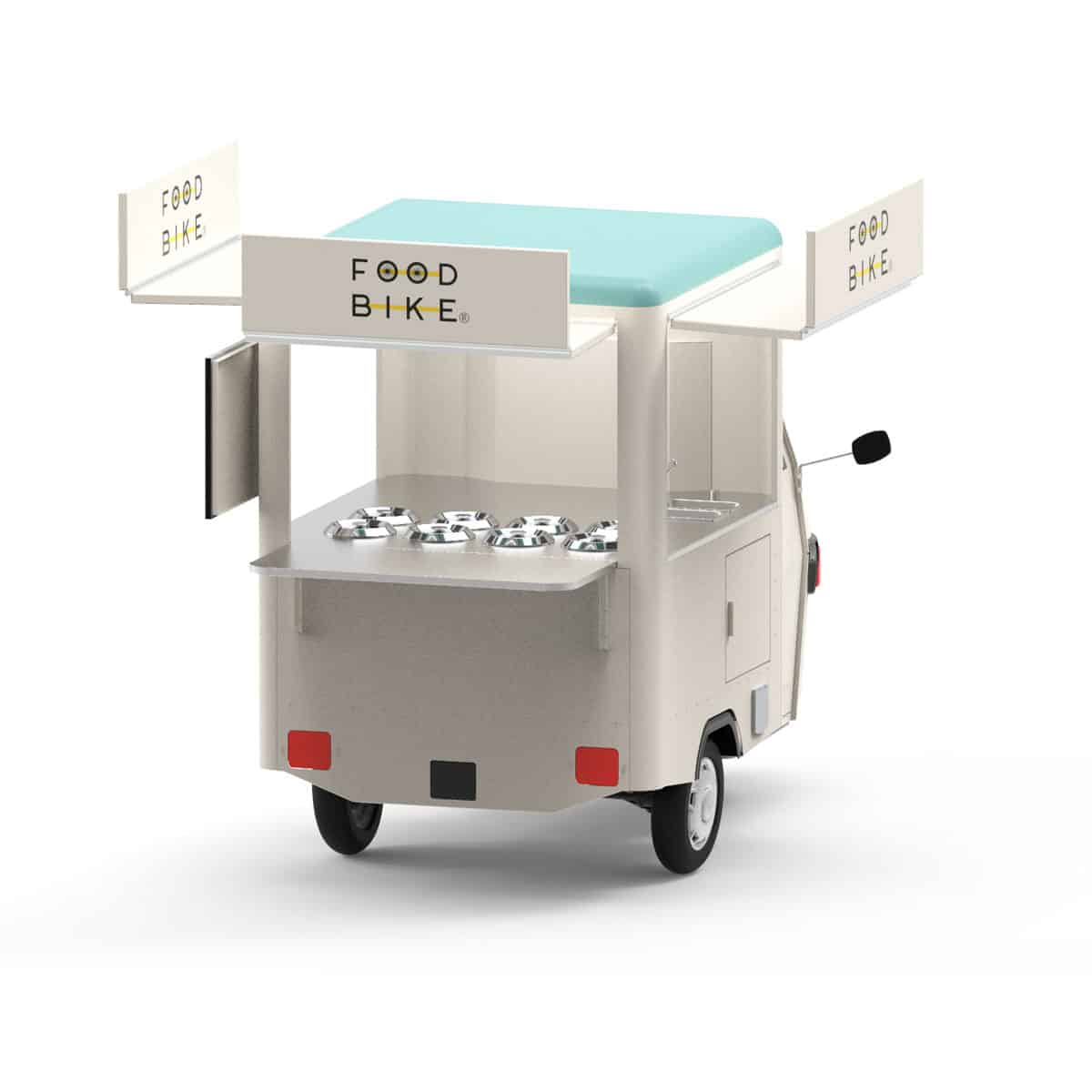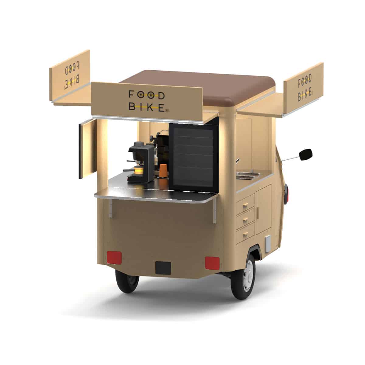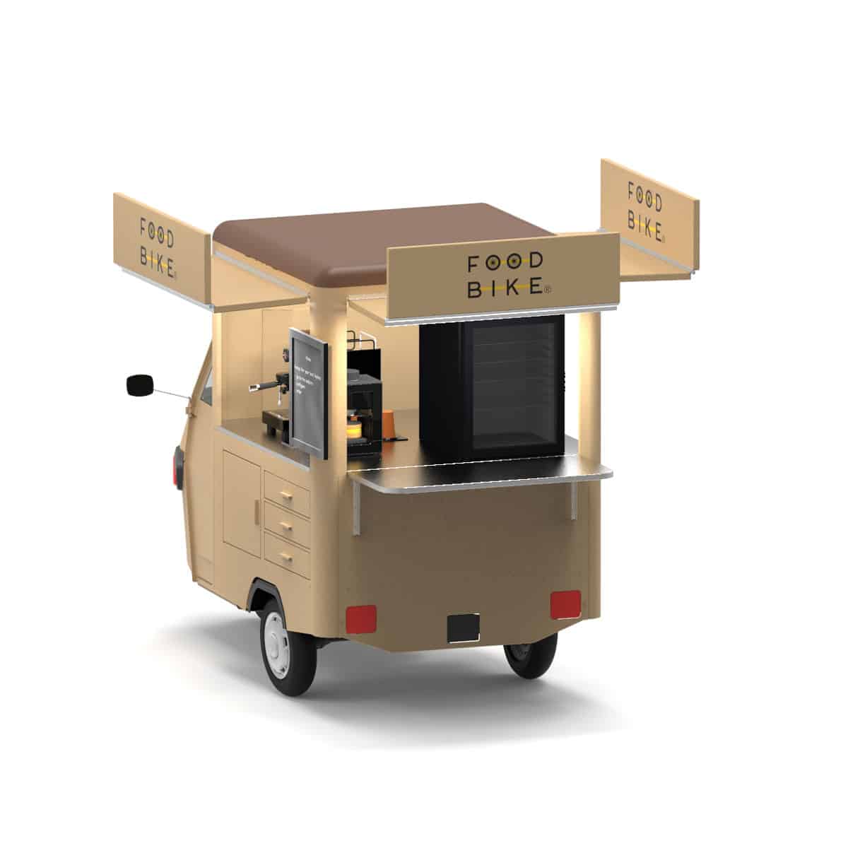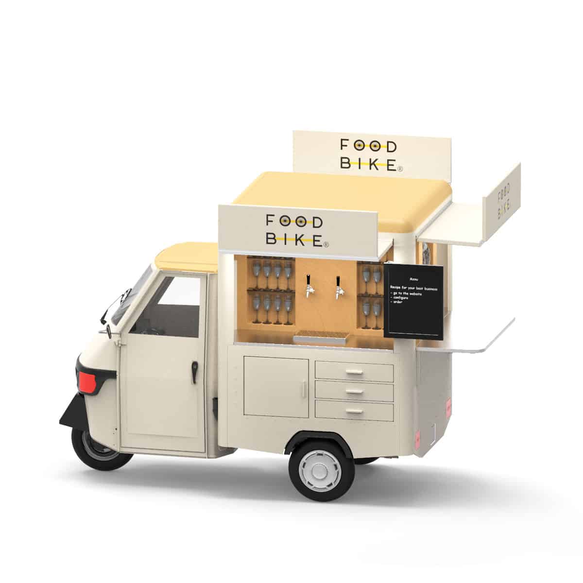 The interior as well as exterior of the module is made of light aluminium. Each version of the truck has is furnished with sanitary annexes with access to hot and cold water. Power system provides over 10 hours of stored energy. Working and folding tables are made of stainless steel. Each Piaggio is equipped with an information board available to customers, which is attached to the front of the truck.
