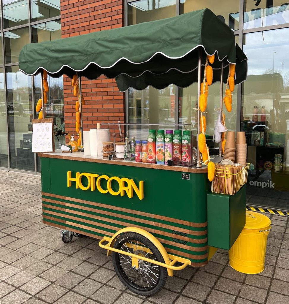 Praktyczny wózek gastronomiczny do kukurydzy idealny na festyny, targi i imprezy plenerowe.