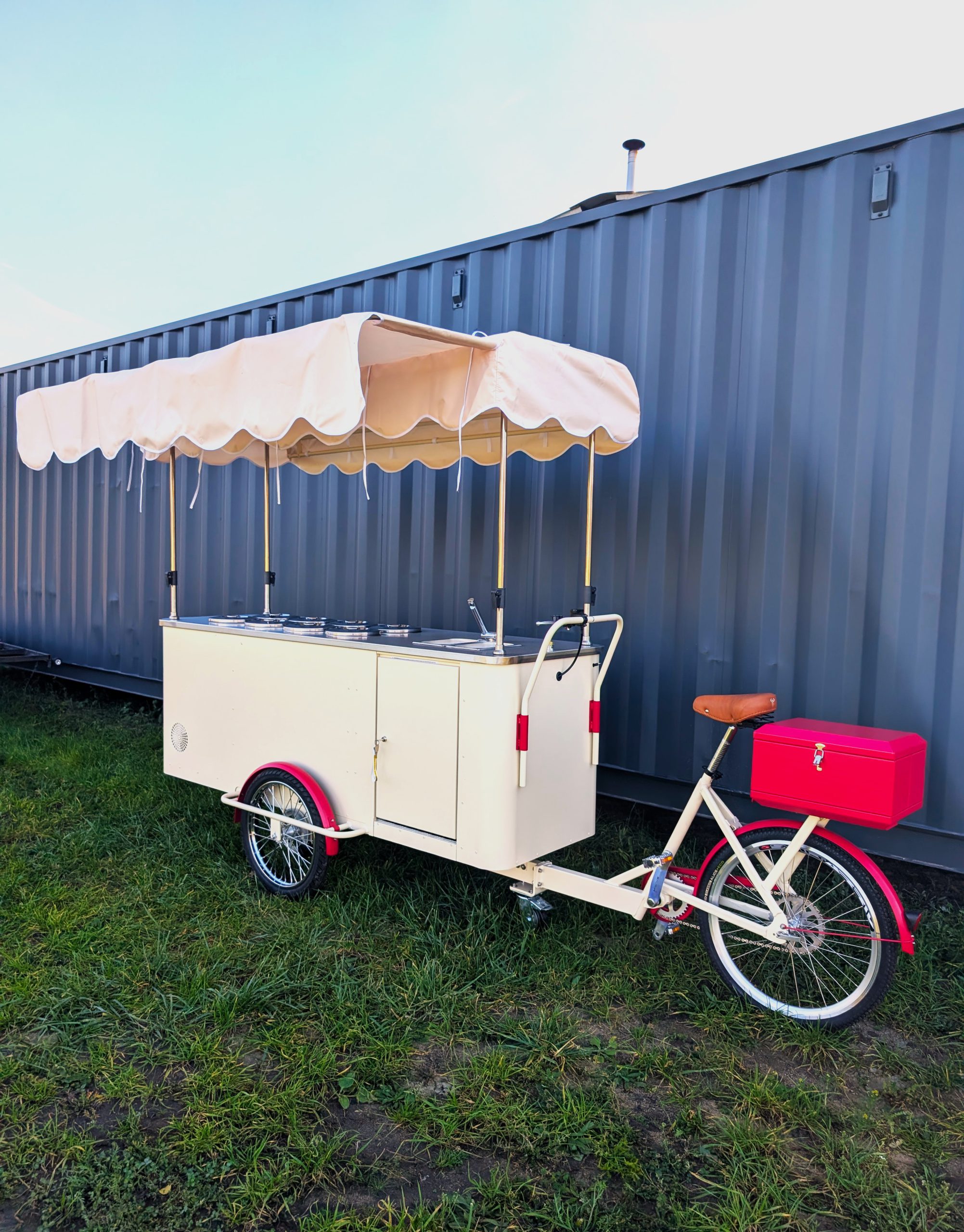 Praktyczny, wysuwany daszek chroni przed słońcem i dodaje elegancji, a całość została dopracowana w każdym detalu – od ergonomicznego układu po estetyczne wykończenie. To kompletny, mobilny punkt sprzedaży lodów, który nie wymaga żadnych dodatkowych przygotowań – wystarczy postawić i zacząć sprzedawać.