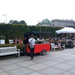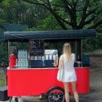 Stylowy i funkcjonalny wózek gastronomiczny do kawy stworzony z myślą o zmiennych warunkach atmosferycznych.