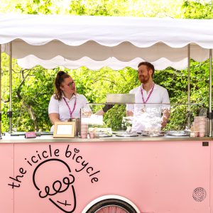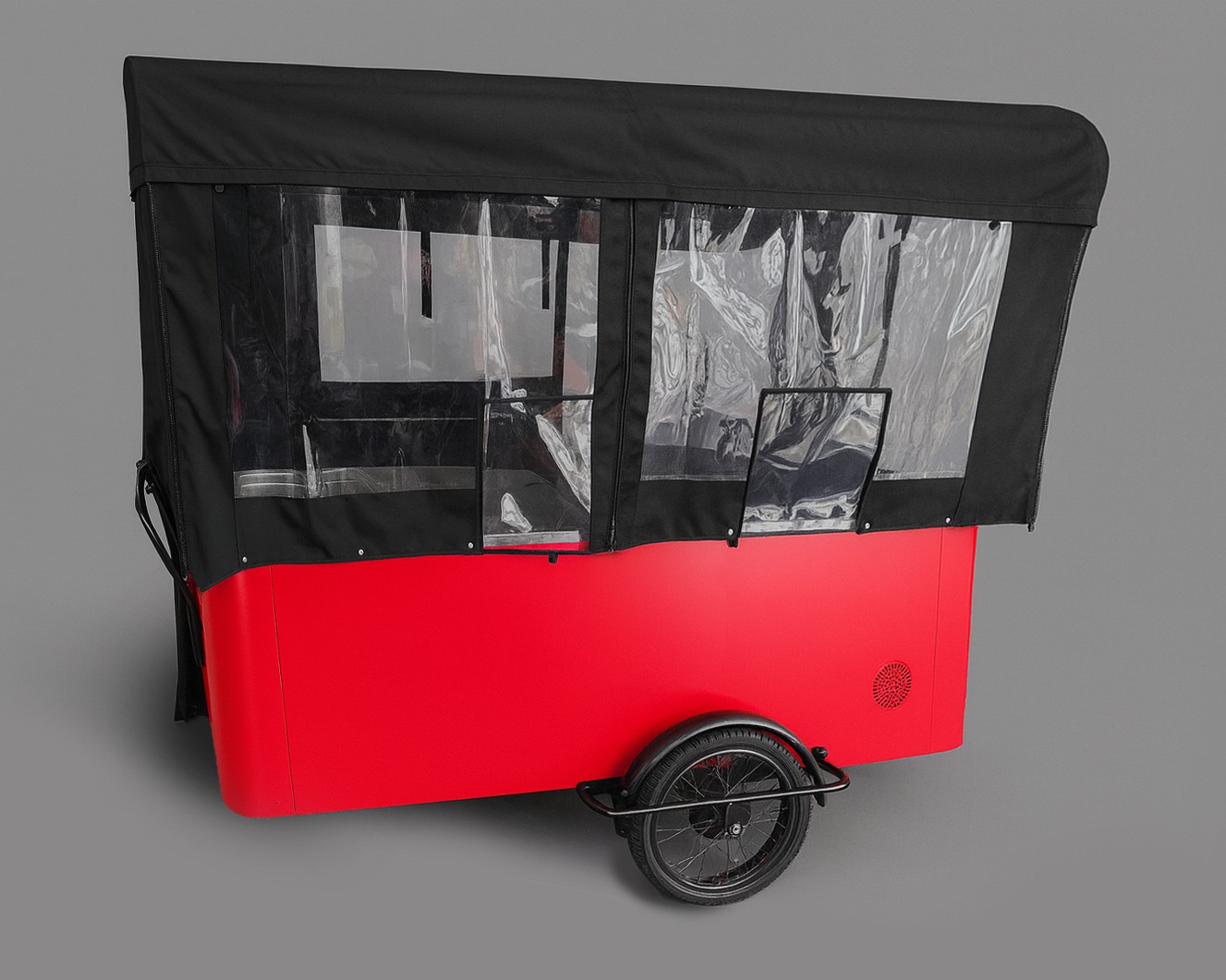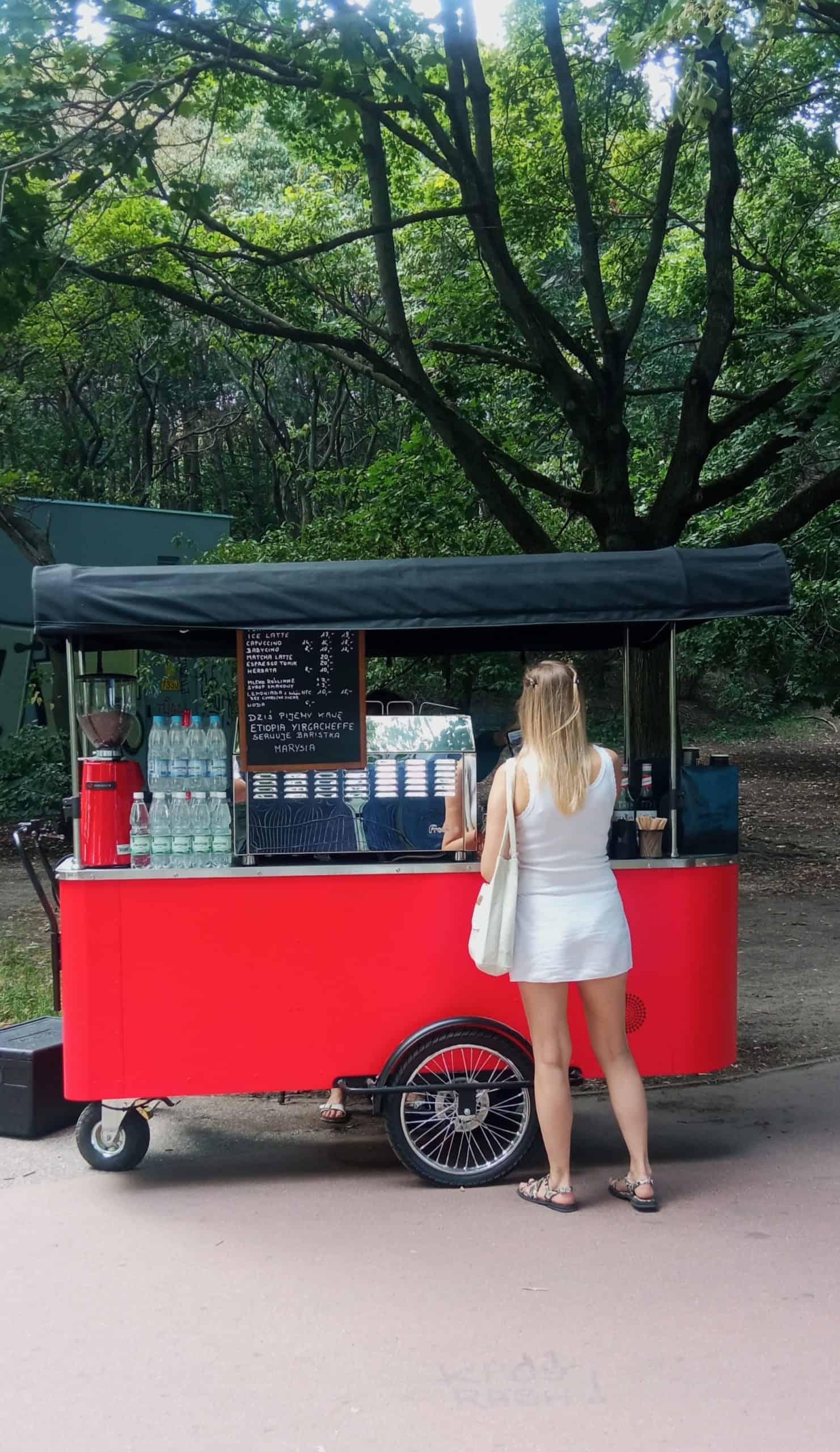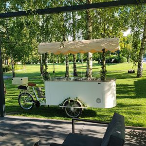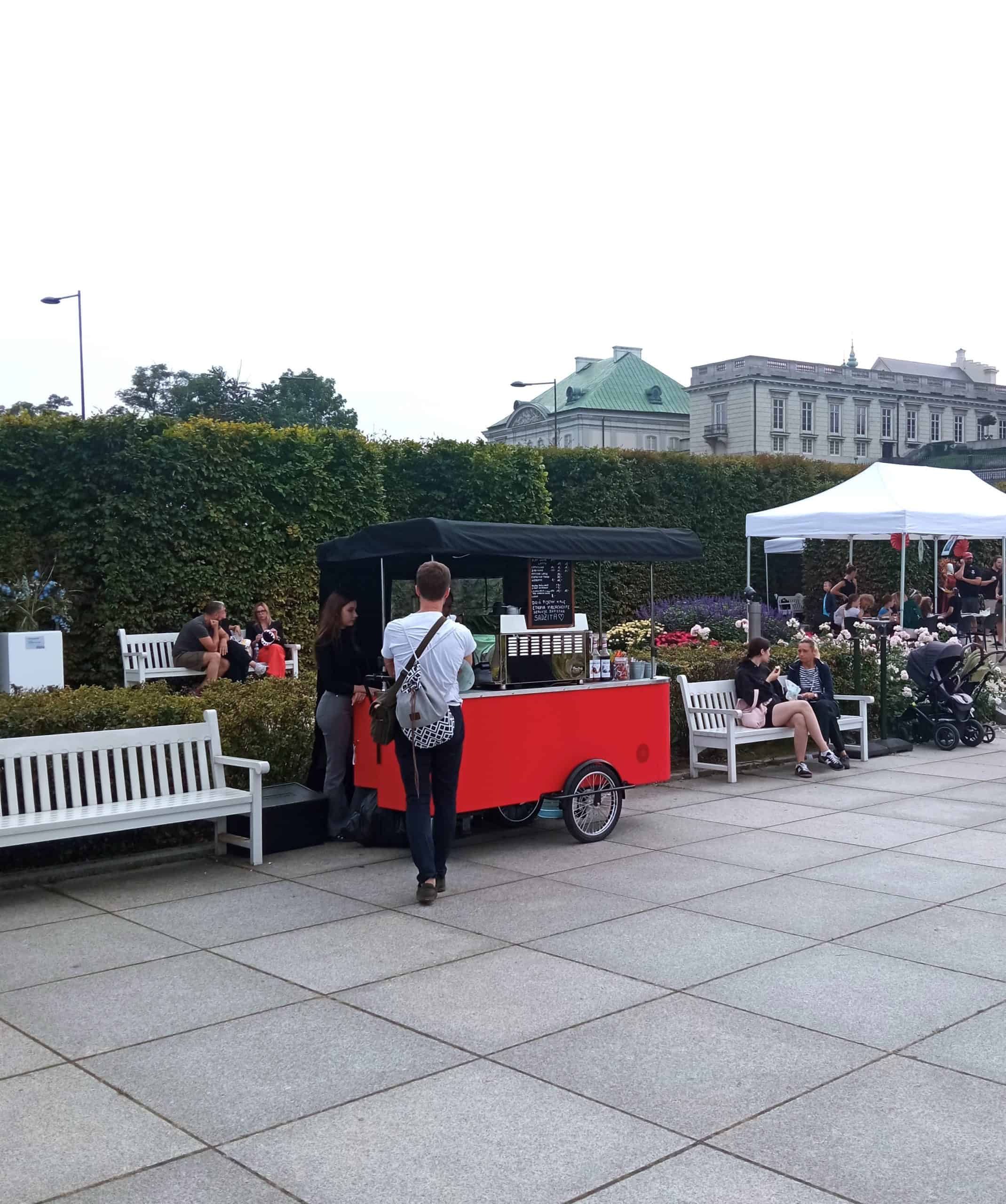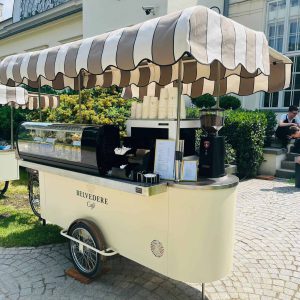 Stylowy i funkcjonalny wózek gastronomiczny do kawy stworzony z myślą o zmiennych warunkach atmosferycznych.