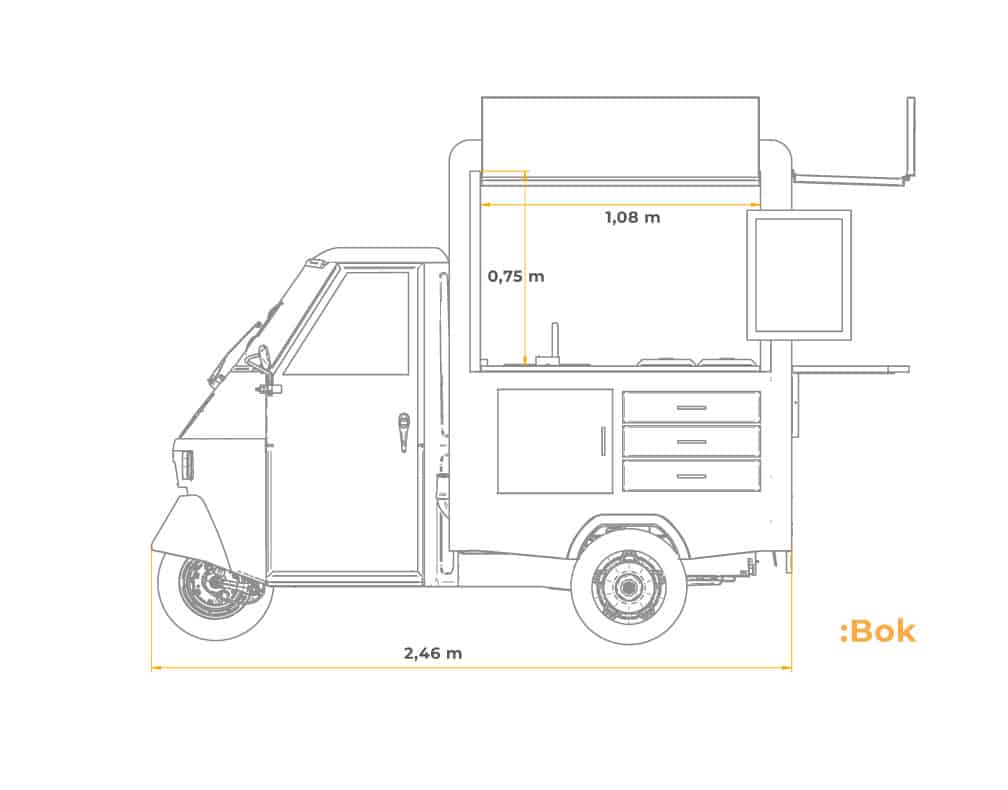 Skorupa jak i moduł wewnętrzny wykonane są z lekkiego aluminium. Każda wersja zabudowy na Piaggio Ape 50 posiada aneks sanitarny z ciepłą i bieżącą wodą. Układ zasilania pozwala na pracę bez podłączenia do prądu nawet powyżej 10 ciu godzin. Blaty robocze oraz rozkładany stolik wykonane są ze stali kwasoodpornej dopuszczonej do kontaktu z żywnością. Każda wersja posiada unikatową tablicę informacyjną na codzienne Menu.